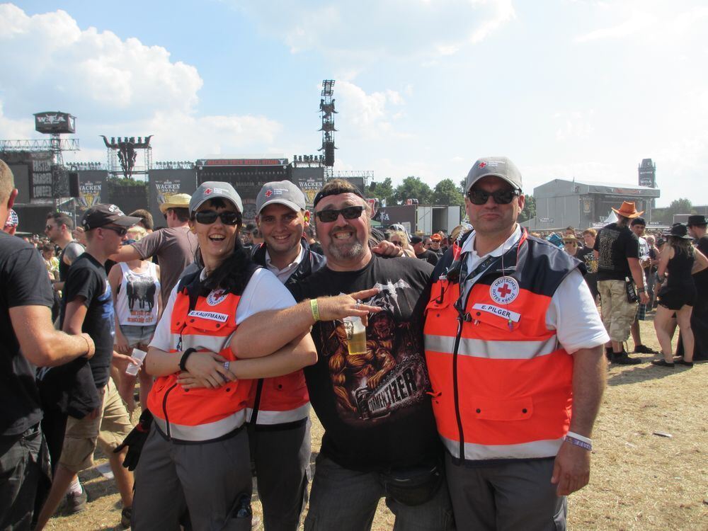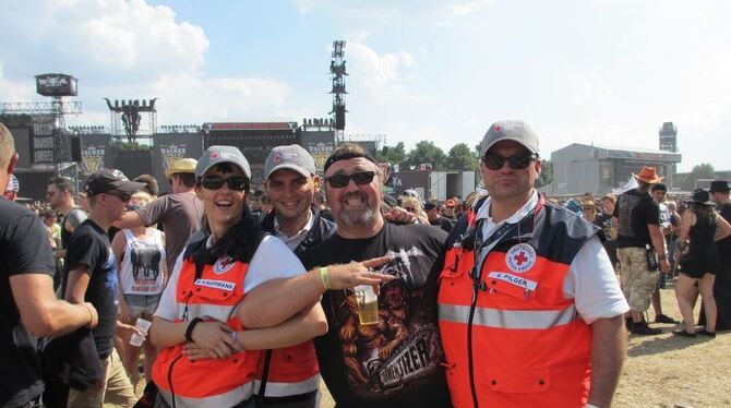 TROCHTELFINGEN-MÄGERKINGEN/WACKEN. Vier Mal waren die DRK-T-Shirts schon in der Waschmaschine. »So richtig weiß sind sie trotzdem nicht mehr geworden«, sagt Eberhard Pilger, Bereitschaftsleiter beim DRK Mägerkingen. Der feine, rote Sand, den der ununterbrochen wehende Wind im hohen Norden aufwirbelt, gehört zum Wacken-Festival wie schwarze Klamotten und verzerrte Gitarren. Ansonsten aber hat die Mägerkinger DRK-Delegation ihren zweitägigen Sanitätseinsatz beim Monster-Metal-Event gut überstanden.