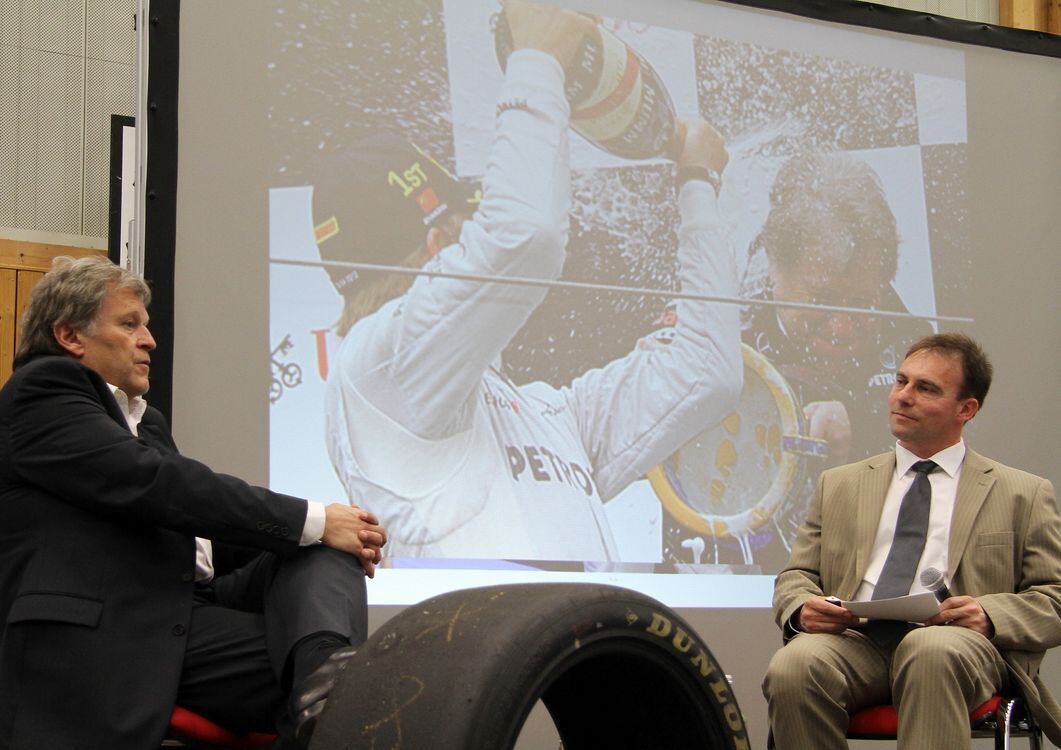 Ein Motorsport-Promi bei der Ausbildungsmesse: Norbert Haug (links) im Gespräch mit Zwiefaltens Schulleiter Armin Masczyk. FOTO: KOZJEK