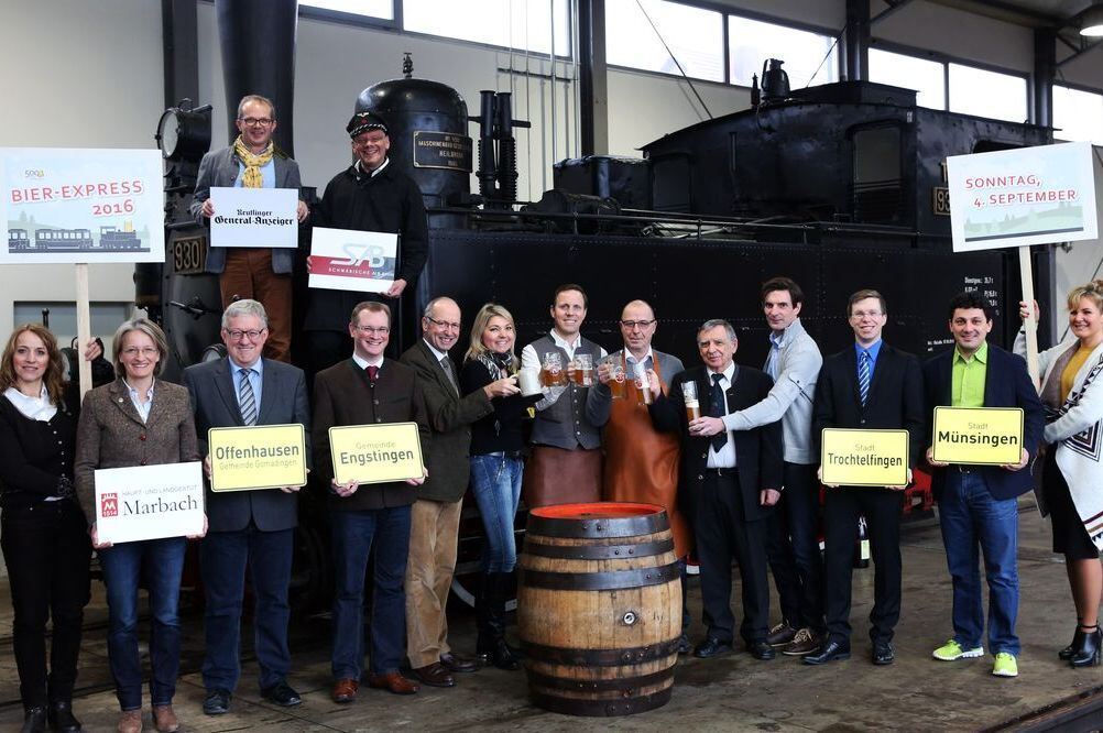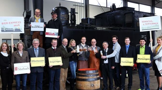 echs Brauer, drei Bürgermeister, ein Tourismuschef, ein Eisenbahner und viele weitere Partner: die Macher des Bier-Expresses im Münsinger Lokschuppen vereint.