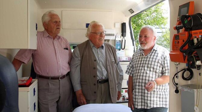 50 Lehrjahre: Die ganze Technik, die Methoden, alles hat sich gewandelt. Peter Heinzelmann (von links) und Fritz Eisele interessieren sich nach wie vor fürs DRK, Arnold Werz präsentiert den beiden Gründern den neuen Krankentransportwagen.