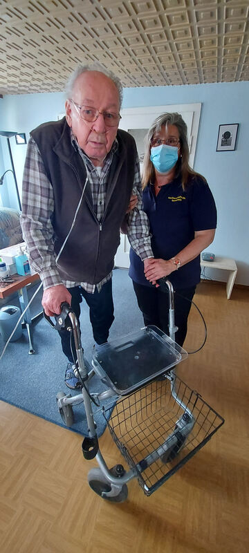 Birgit Schäfer ist am Dienstagmorgen im Einsatz bei Willi Munz. Der Senior ist froh darüber, dass es die Nachbarschaftshilfe gibt und er so weiter allein leben kann. FOTO: FISCHER