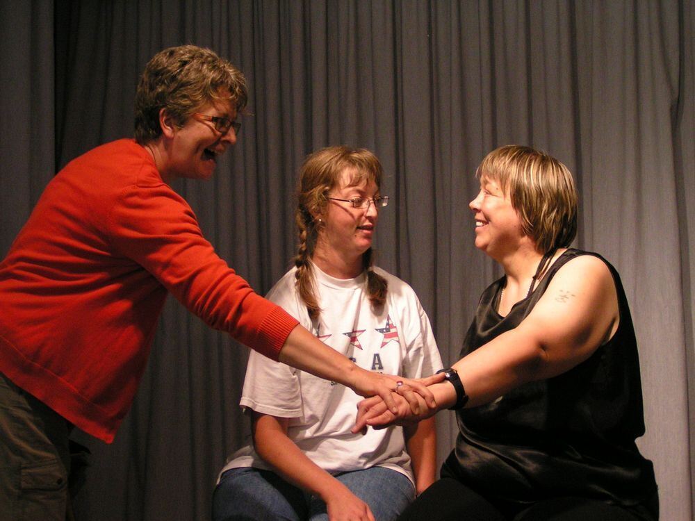 Kleine Regieanweisung für einen gespielten Witz von Angelika Janssen (links) an die Theaterschauspieler.