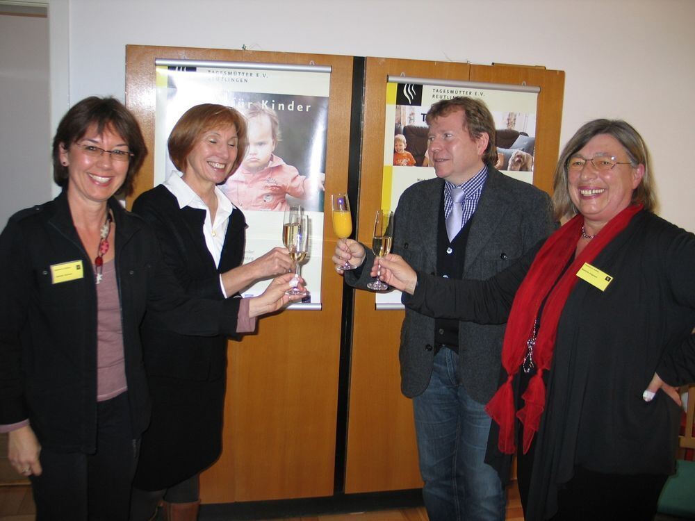 Endlich »angekommen« in Münsingen: Gabi Euchner, von links, Anne Mack, Bürgermeister Mike Münzing und Mathilde Allgöwer stoßen auf die Eröffnung der Außenstelle Alb des Tagesmüttervereins Reutlingen im Alten Rathaus in Münsingen an.