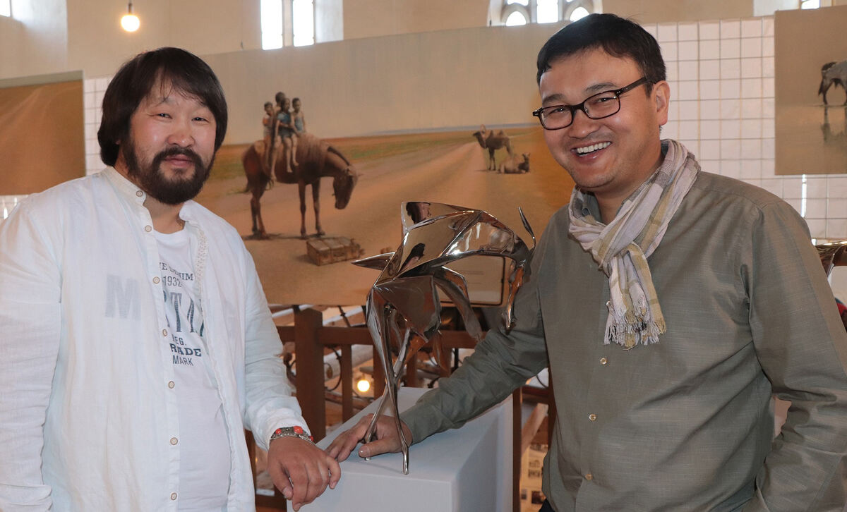 Orchibold Ayurzana (links) und Gan-Erdene Tsend, beide Künstler aus der Mongolei, zeigen Skulpturen und Bilder in der Klosterkirche Offenhausen. FOTO: BLOCHING