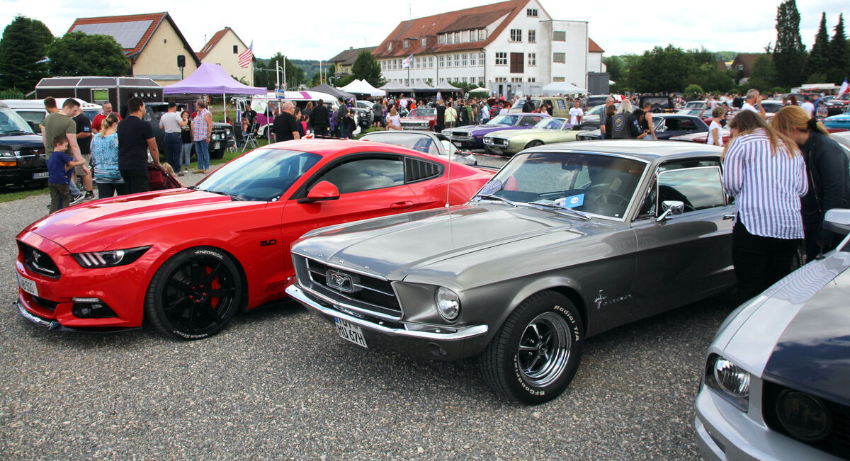 Legendäre Sportwagen: Ein neuer und ein älterer Ford Mustang nebeneinander.