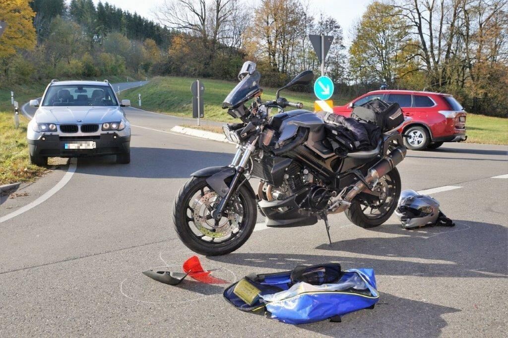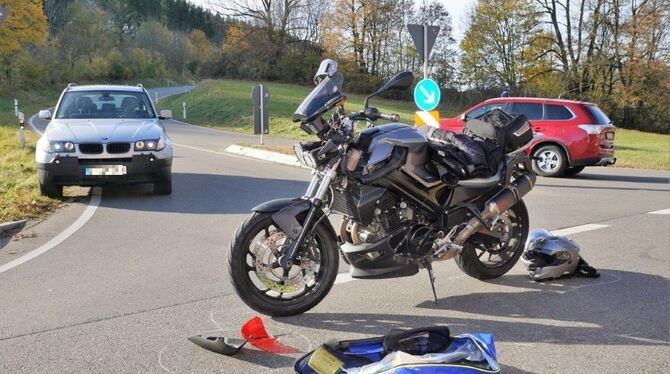 MÜNSINGEN. Ein schwerer Verkehrsunfall hat sich am Sonntagmittag zwischen Bad Urach-Seeburg und Münsingen ereignet. Ein 44-jähriger Autofahrer fuhr gegen 13:55 Uhr mit seinem VW Passat auf der Kreisstraße 6703. Er kam aus Richtung Rietheim und wollte an der Einmündung zur B 465 nach links in Richtung Seeburg abbiegen. Dort missachtete er die Vorfahrt der auf der Bundesstraße fahrende 53-jährige Motorradfahrerin. Die Motorradfahrerin fuhr die B 465 von Seeburg in Richtung Münsingen. Die Motorradfahrerin prallte in den hinteren Bereich des VW Passat und fiel auf die Straße. Unglücklicherweise landete ihr Motorrad auf ihrem linken Bein, was zur Folge hatte, dass sie sich schwer verletzte und in eine Klinik verbracht werden musste. Neben dem Rettungsdienst war auch die freiwillige Feuerwehr Münsingen mit zwei Fahrzeugen und acht Einsatzkräften vor Ort. Es entstand ein Schaden von etwa 2.500 Euro. (pol)