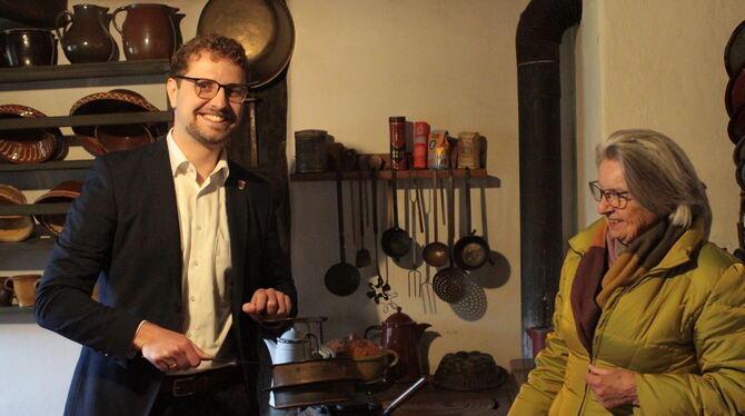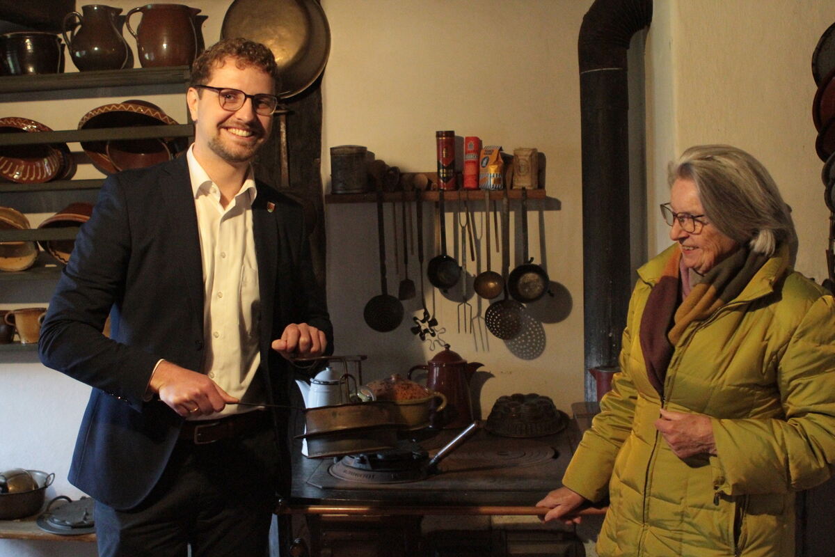 In so einer Mühle hat man früher Gerstenkörner für »Blümleskaffee« gemahlen: Bürgermeister Simon Baier staunt, was Museums-Teamleiterin Annemarie Fröhlich alles aus dem Alltag aus gar nicht so lang zurückliegenden Zeiten berichten kann.