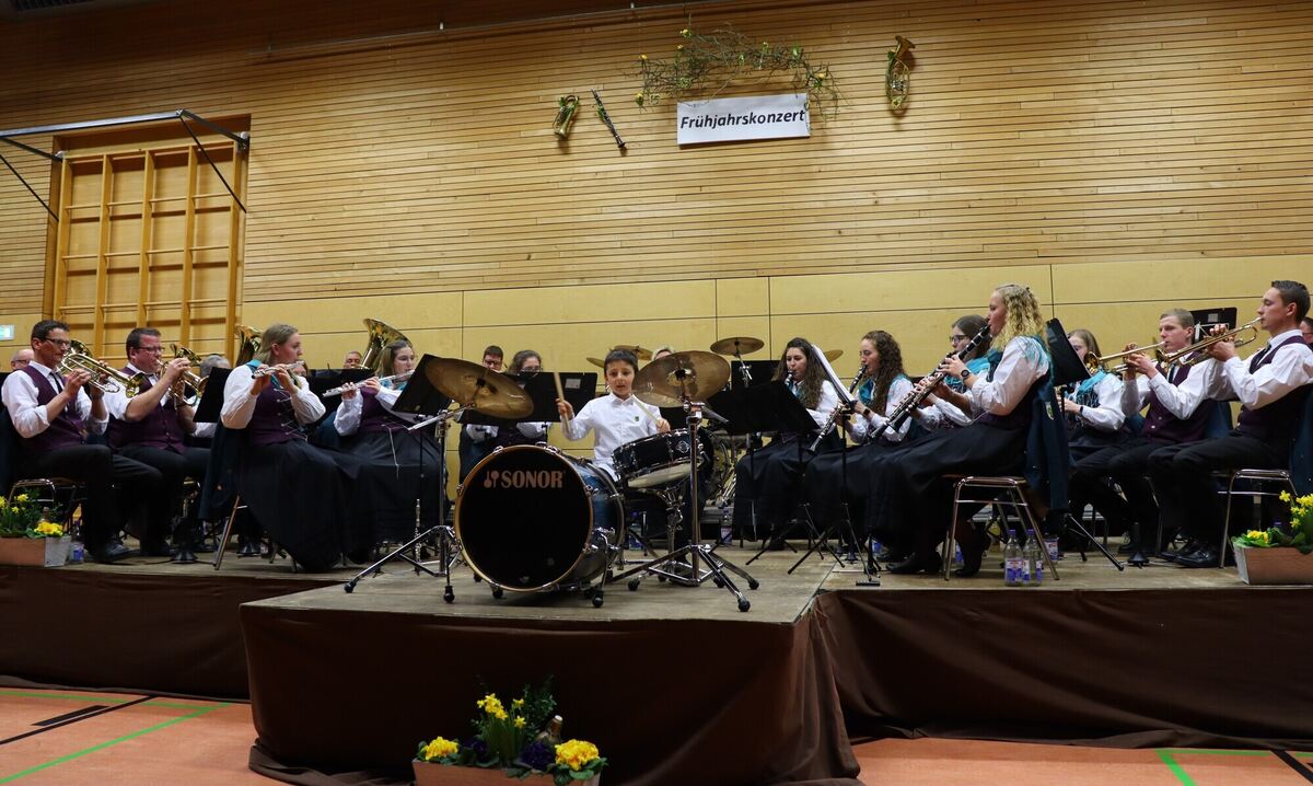 MÜNSINGEN-BÖTTINGEN. Mit einem Auftritt der besonderen Art überraschte die Musikkapelle Böttingen bei ihrem Frühjahrskonzert in der frühlingshaft geschmückten Alenberghalle in Münsingen das Publikum: Noah Bösch führte mit seinen gerade mal sechs Jahren die Kapelle gekonnt am Schlagzeug durch die Polka »Ein junger Egerländer« und erntete den wohl größten Applaus des Abends.