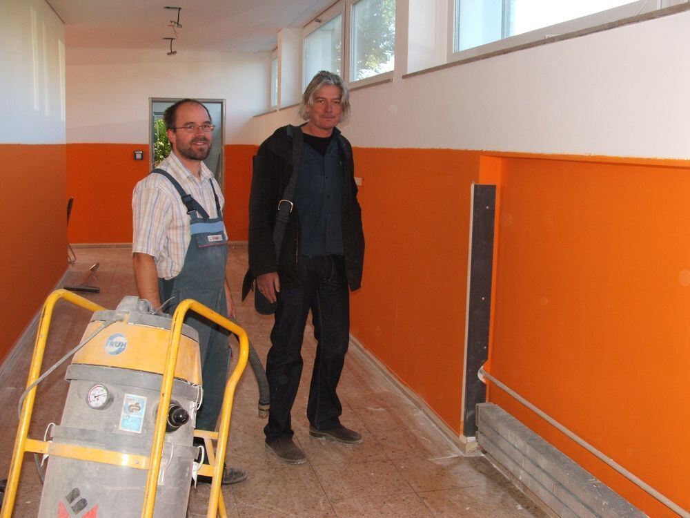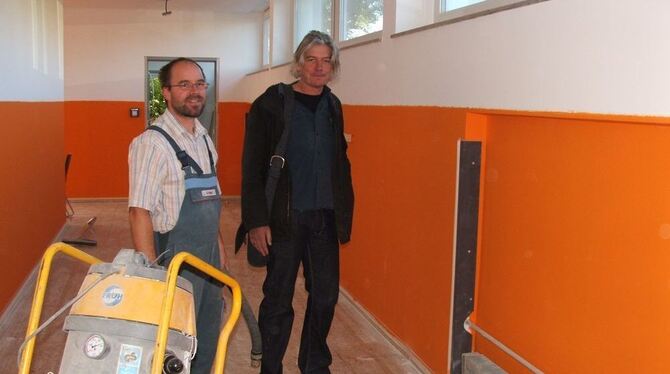 Architekt Elmar Heinemann und Hausmeister Oliver Kuhn im orangenfarbenen ersten Stock.