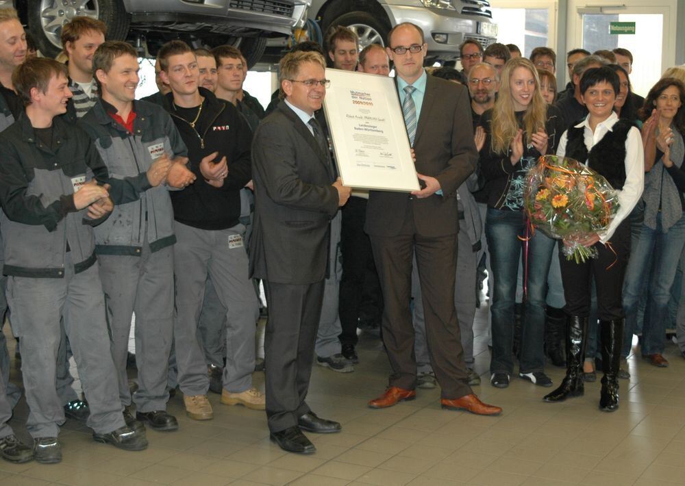 Im Kreis von Paravan-Mitarbeitern erhielt Roland Arnold die Urkunde im Wettbewerb »Mutmacher der Nation«. FOTO: LAMPERT