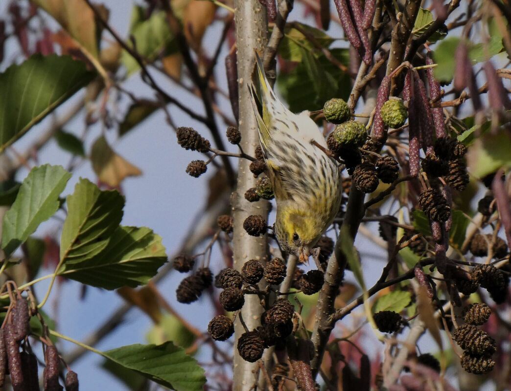 Spannend wird sein, ob außer Erlenzeisigen auch andere Gäste wie Bergfinken, Birkenzeisige oder Seidenschwänze, die aus kälteren Regionen in wärmere, südlichere Gefilde ausweichen, darunter sein werden. Am schwierigsten dürfte dabei gelegentlich sein, die Arten jeweils exakt zu bestimmen, sehen doch Vögel im Jugendkleid aus dem Vorjahr sowie beispielsweise Erlenzeisigmännchen und Weibchen dieser Vogelart nicht immer gleich aus. Merkmale des Männchens sind Stirn, Scheitel und kleiner Kinnfleck in Schwarz, beim Weibchen eine diffuse Streifung auf dem Schädel und eine ausgeprägte Längsstreifung an der Unterseite. (GEA)