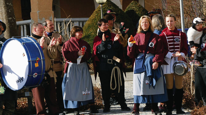 In Engstingen hatten die Narrenräten, »Hurgele«, »Gosgarda Käther«, »Schlossgassa Raiber« und die Lombakabell vor dem Rathaus Stellung bezogen.