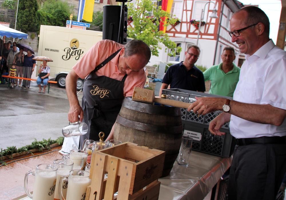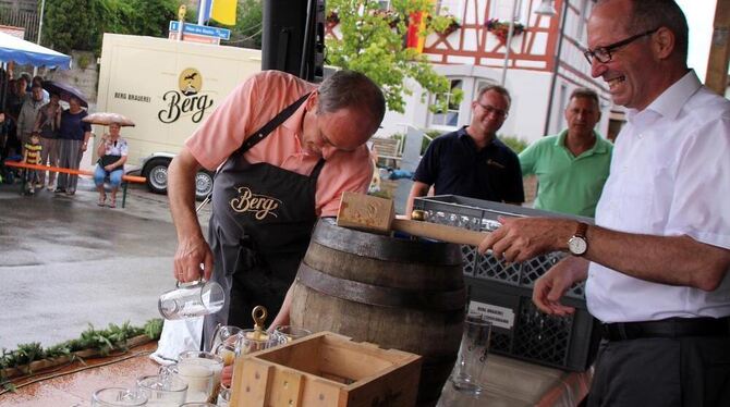Geschafft: Sonnenbühls Bürgermeister Uwe Morgenstern und Brauchereichef Uli Zimmermann, rechts, freuen sich über den gelungenen Fassanstich zum Auftakt der Hockete.