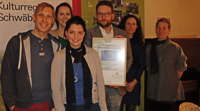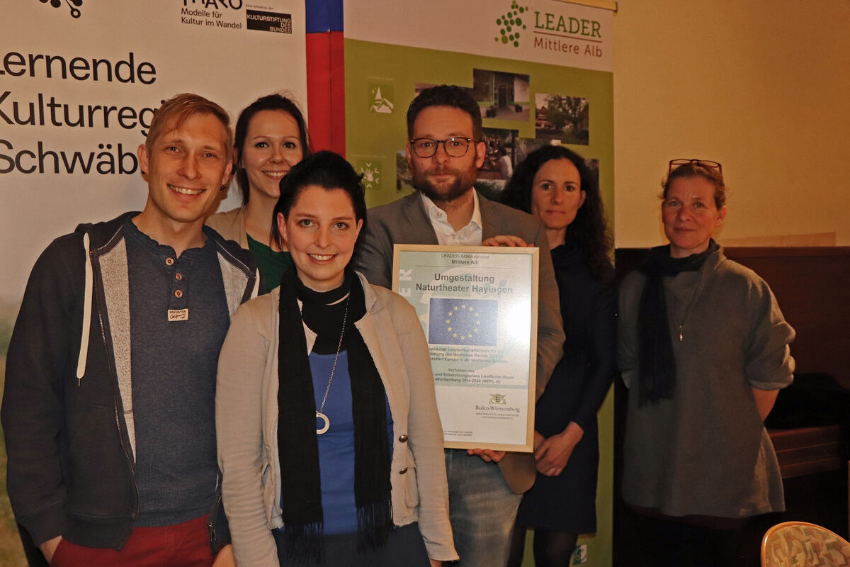 Startschuss fürs Leader-Projekt Naturtheater (von links): Johannes Schleker (künstlerische Leitung), Elisabeth Markwardt (Leader), Silvie Marks (künstlerische Leitung), Bürgermeister Kevin Dorner, Judith Bildhauer (Trafo) und Babette Ulmer (organisatorische Leitung). FOTO: BLOCHING
