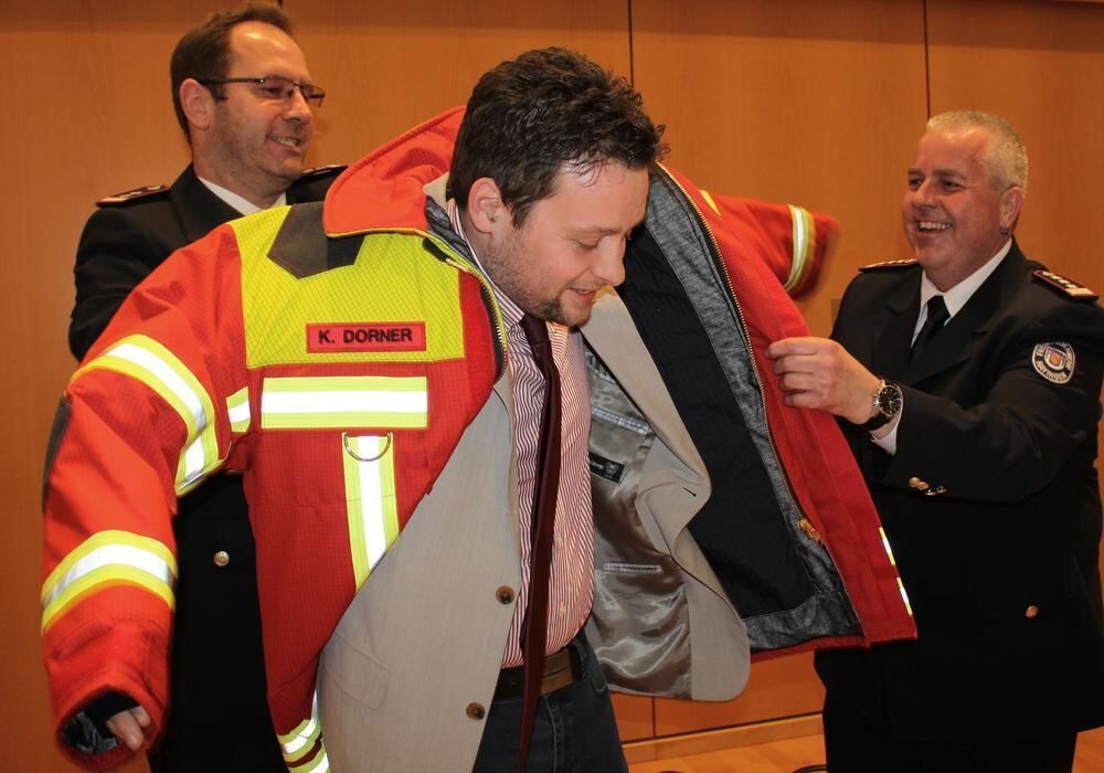 Bürgermeister Kevin Dorner bekam von Gesamtkommandant Clemens Oberhofer (rechts) und dessen Stellvertreter Klaus Pfister eine Einsatzjacke überreicht. FOTO: BLOCHING