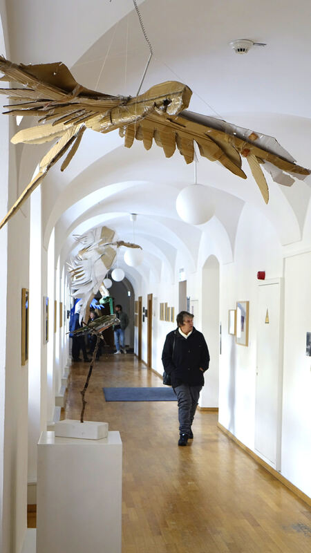 GAMMERTINGEN-MARIABERG. »Ich glaube, es wandelt sich einfach alles«: Unter dem Titel »Wandelraum« wurde die neue Werkschau der künstlerischen Ateliers Mariabergs im ehemaligen Kloster eröffnet. Ein ganzer Schwarm aus lebensgroßen Papp-Vögeln sowie farbenfrohe Webstücke und zahlreiche Gemälde über das Seelenleben der Künstlerinnen und Künstler mit Behinderung präsentieren die Vielfalt und künstlerische Kraft der sogenannten »Outsider Art«.