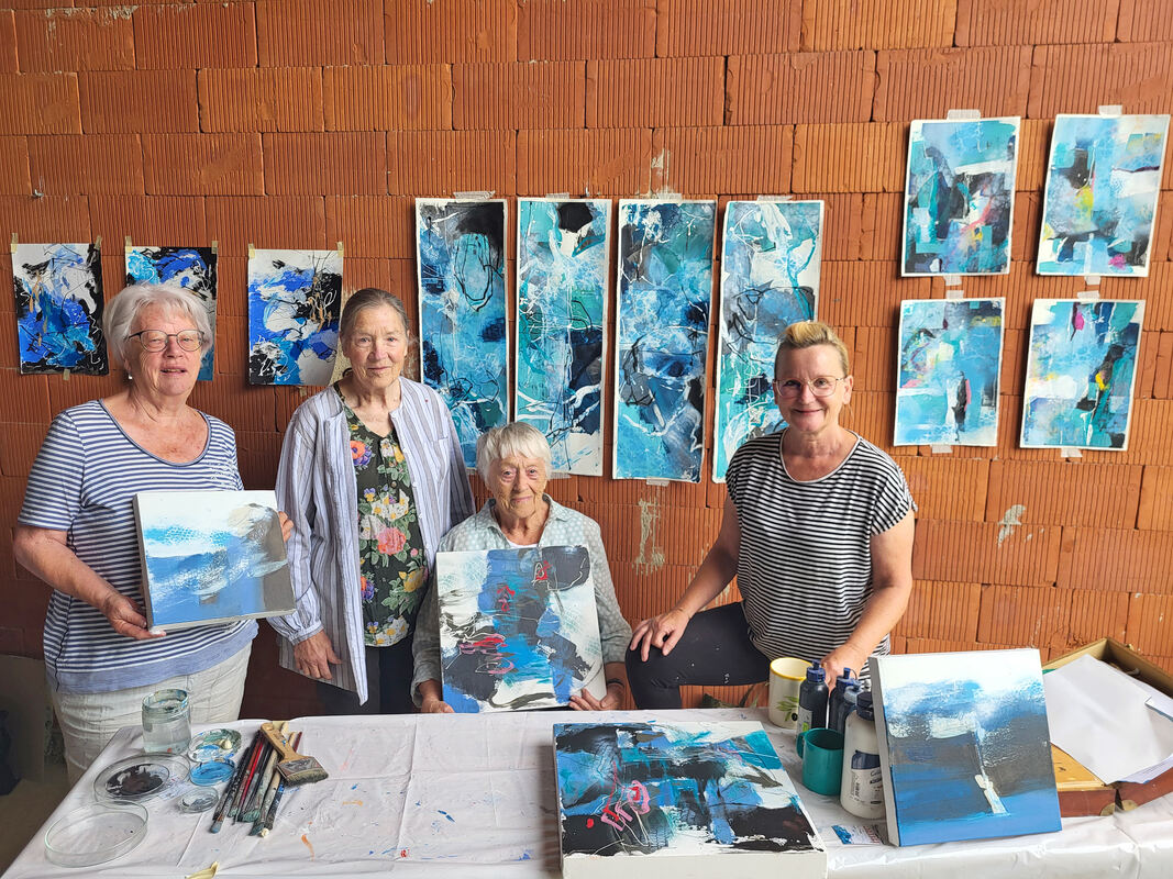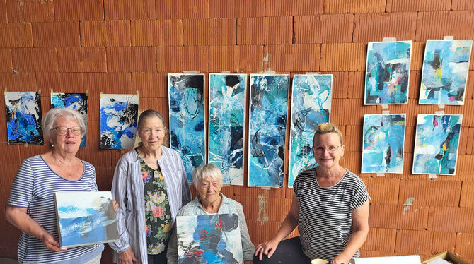 Seit vielen Jahren treffen sie sich die vier Frauen regelmäßig zum gemeinsamen Malen und zum Austausch. Sie geben sich gegenseitig Anregungen und erweitern dadurch ihren eigenen künstlerischen Horizont. Unter anderem beim jährlichen Kurs mit Karl Striebel, der in diesem Jahr bereits zum 15. Mal auf den Hülbenhof gekommen ist, um insgesamt zehn Malerinnen im Alter zwischen 33 und 91 Jahren neue Techniken zu zeigen. Mit dabei ist auch die Gruppe der vier Künstlerinnen, die Werke aus diesem zweitägigen Kurs mit dem Titel »Das edle Blau« jetzt in ihrer Ausstellung im August zeigen wollen.