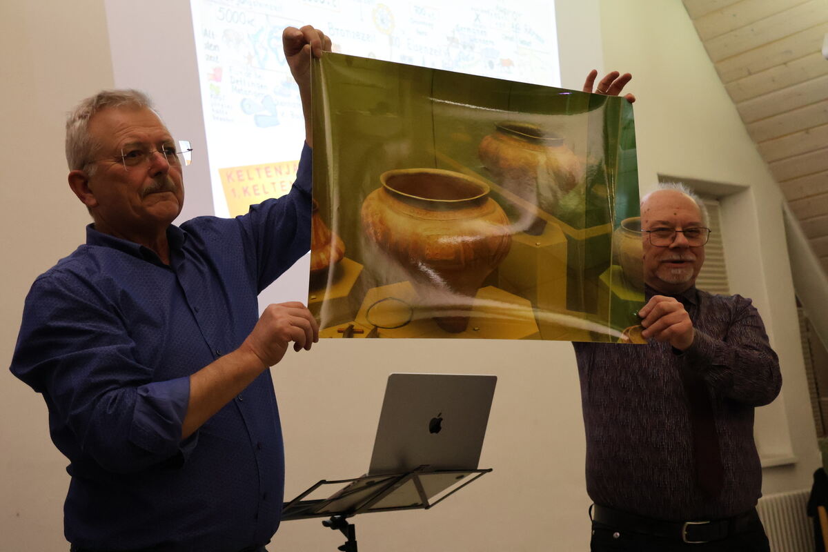 Hermann Liebenow (links) und Michael Schwarz zeigen Ausschnitte aus ihrer Broschüre »Bronze- und eisenzeitliche Funde in St.Johann«