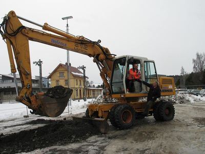 Ein rechter Eisenbahner kann auch baggern: Bernd-Matthias Weckler, der Vorsitzende des Vereins Schwäbische Alb-Bahn, ließ es beim symbolischen ersten Baggerbiss für den Münsinger Lokschuppen nicht bei einer Schaufel Boden bewenden.