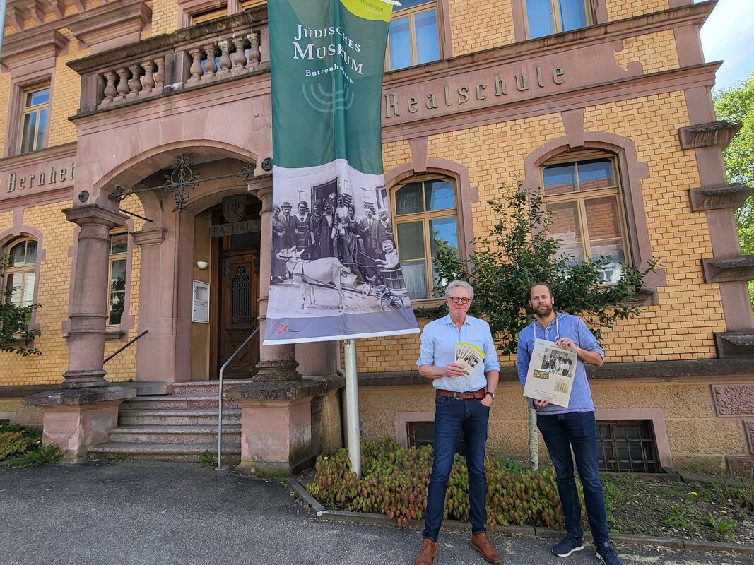 Stefan Hartmaier (links) und Yannik Krebs stellen die neu gestalteten Flyer, Plakate und Fahne zur Bewerbung des Jüdischen Museums Buttenhausen vor.