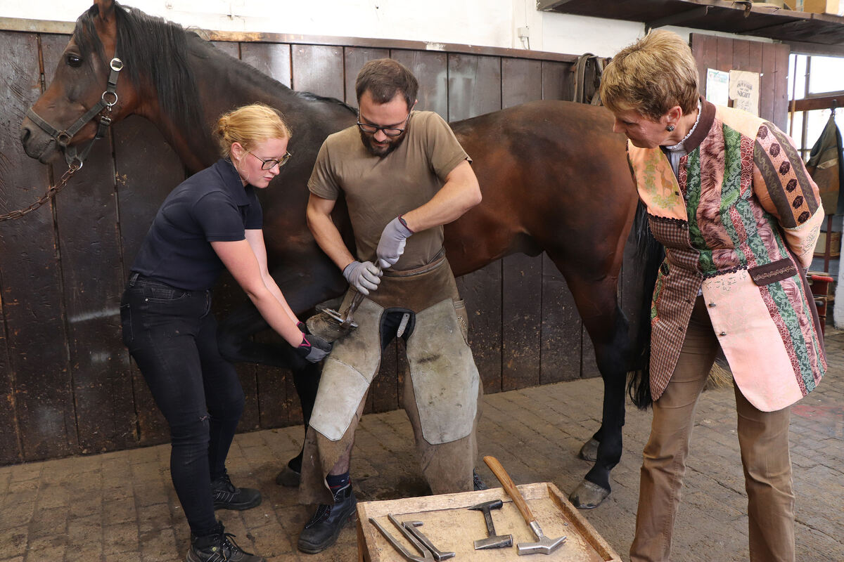 Staatssekretärin Friedlinde Gurr-Hirsch schaute Hufschmied-Praktikant Kai Meisenbacher über die Schulter. FOTO: BLOCHING