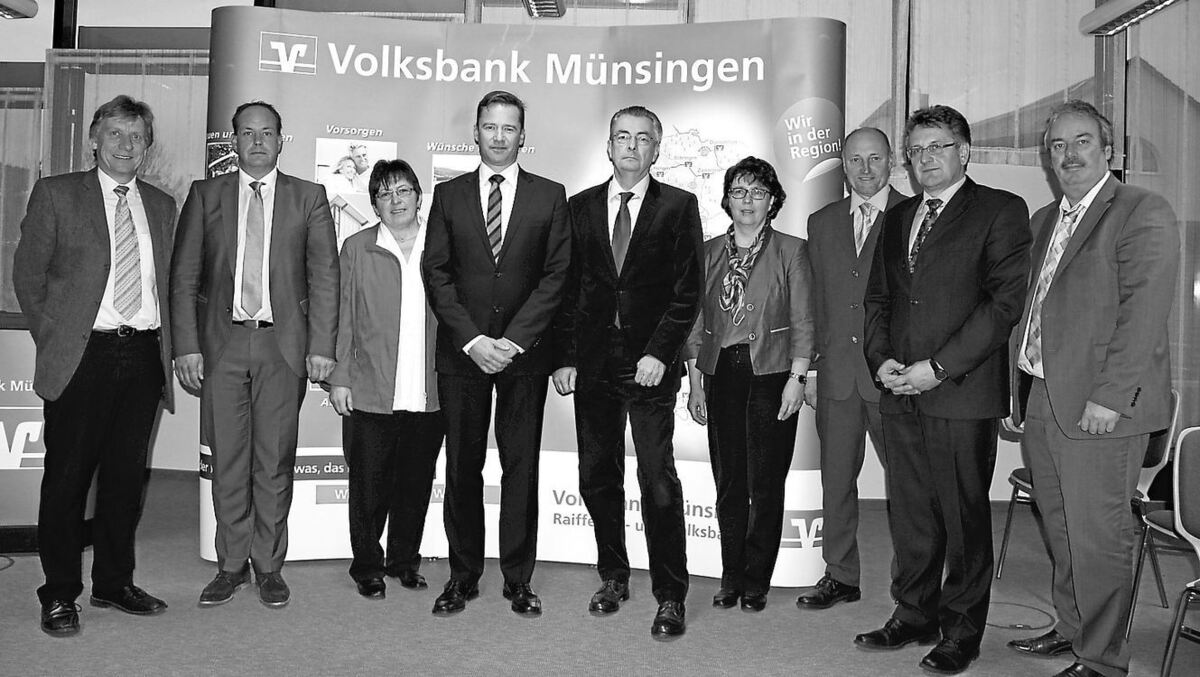 Die Aufsichtsratsmitglieder der Volksbank Münsingen rahmen den neuen Vorstand ein. Geschlossenheit zeigen (von links) Arno Stumm, Michael Manz, Aufsichtsratsvorsitzende Christl Schneider, die Vorstände Michael Mayer und Jürgen Bunzendahl, Monika Schindler, Erhard Holzschuh, Josef Ott und Rainer Buck. GEA-FOTO: DEWALD