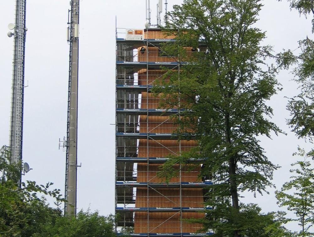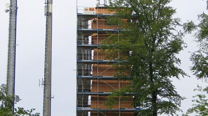 Neues Kleid: Gomadingens Sternbergturm leuchtet jetzt im warmen Braun unbehandelter Douglasie. FOTO: GROSS