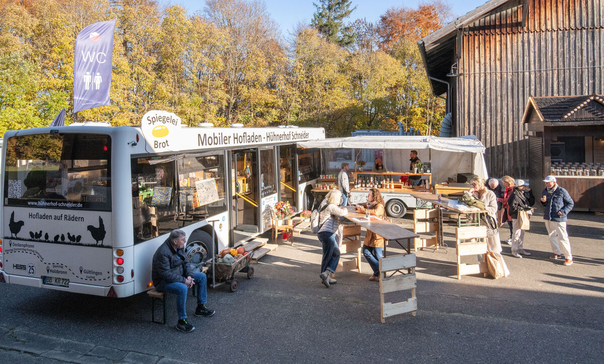 Hühner-Bus. Robin und Vanessa Schneider sind mit dem Bus da. Ihrem eigenen Bus. Genau genommen einem Bus-Anhänger, den sie in mehr als zweistündiger Anfahrt mit dem Traktor von Deckenpfronn im Kreis Böblingen nach Münsingen geschleppt haben. Der ausrangierte Linienbusanhänger, der einst im Reutlinger Stadtverkehr auf Tour war, ist jetzt ein mobiler Hofladen. Das junge Ehepaar, das den Hühnerhof mit 2.500 Legehennen in dritter Generation führt, geht kreative Wege in der Direktvermarktung. Der Bus bringt Eier und viele weitere Produkte von befreundeten Höfen an Orte, wo es keine Läden mehr gibt - und zur schön & gut, die die Schneiders vor ein paar Jahren als Besucher für sich entdeckt haben. Jetzt sind sie zum zweiten Mal als Aussteller dabei und haben mit einem echten Klassiker einen Hit gelandet: Die Schneiders hauen ein Spiegelei nach dem anderen in die Pfanne und servieren es auf Brot - pur und lecker.