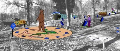 Ein zentraler Platz mit einem Mosaik des Erlebnisbereiches Bärenhöhle, ein dreidimensionaler Bär als »Eyecatcher«, verschiedene Guck- und Hör-Rohre (blau) im Boden, ein Erdhügel (rechts im Hintergrund), der einen Grabungshorizont offen legt und ein neuer gestalteter Höhleneingang, das sind die Grundelemente der Konzeption für die Bärenhöhle. Bei den in das Foto eingearbeiteten Darstellungen handelt es sich um Stilisierungen der vorgeschlagenen Elemente. Was davon verwirklicht wird, entscheidet der Gemeinderat.