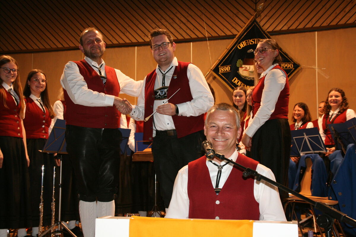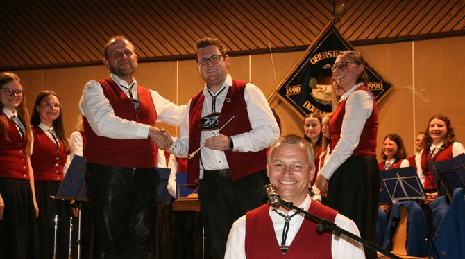 Franz Geiselhart (von links) übergibt den Dirigentenstab an Marcel Jäger, mit ihnen freuen sich Mathias Roggenstein, der Vorsitzende der Oberstetter Dorfmusikanten, und die Musikantinnen und Musikanten. FOTO: THUMM
