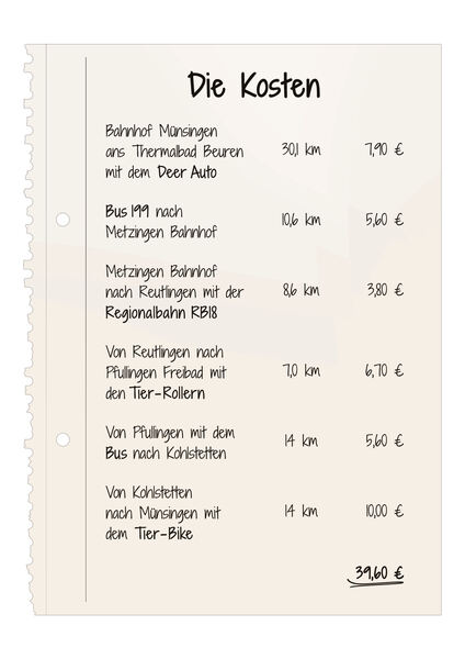 Ganz billig ist so ein Ausflug auch nicht, insgesamt haben wir pro Person rund 40 Euro ausgegeben. Dafür hat er einen hohen Spaßfaktor, der sein Geld wert ist – vor allem dann, wenn man bisher weder ein E-Auto noch einen E-Roller benutzt hat. Gut: Bei Deer wird nicht nach Minuten, sondern nach Stunden abgerechnet. Der Anbieter sitzt im Schwarzwald und will vor allem auch den Ländlichen Raum bedienen. Hier sind die zurückgelegten Strecken eher lang, die Fahrzeiten sind es auch. 7,90 Euro pro Stunde sind fair. Das ist, gemessen an den Preisen für die Bus- und Bahntickets, vor allem aber auch an den Leihgebühren für die Elektro-Roller und E-Bikes, ziemlich günstig: Der Anbieter Tier nimmt für seine Roller und Räder pro Fahrt einen Euro Grundgebühr und zusätzlich 19 Cent für jede Fahrminute. Für die sieben Kilometer mit dem Roller von Reutlingen nach Pfullingen zahlen wir 6,70 Euro, für die Radtour von Kohlstetten nach Münsingen (14 Kilometer) werden zehn Euro fällig. Dass die E-Bikes leistungstechnisch eher schwach auf der Brust sind, ist für den Alb-Einsatz ein Minuspunkt.