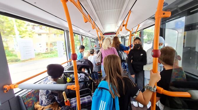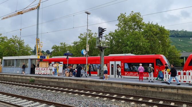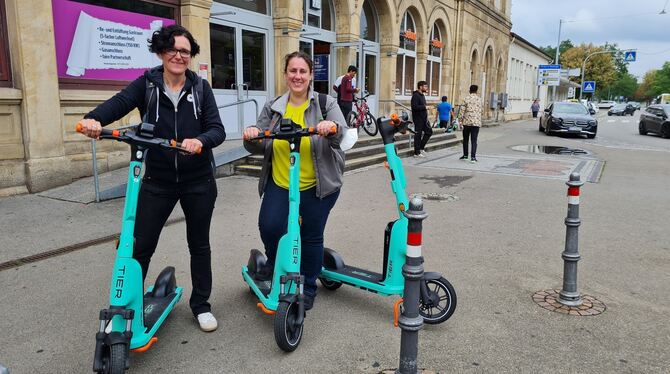 Man könnte – nach der Wellness-Pause im Thermalbad (für uns bleibt sie ein Wunsch, wir haben keine Zeit) – einfach wieder mit dem E-Mietwagen zurück nach Münsingen fahren. Unser Abenteuer ist aber noch nicht zu Ende. Deshalb marschieren wir zu Fuß an die Bushaltestelle in Balzholz und lassen uns nach Metzingen chauffieren. Dort könnte man Shoppen oder Kaffee am Kelternplatz trinken. Machen wir in dem Fall nicht, wir wollen weiter nach Reutlingen – und zwar mit dem Zug. Am Metzinger Bahnhof wird eine Verspätung von fünf Minuten angezeigt, aus der erst zehn und dann noch ein paar mehr werden. Wertvolle Zeit, die uns nachher bei unserer Pause im Eiscafé in Pfullingen fehlen wird und die wir mit unserem nächsten Verkehrsmittel auch nicht reinholen können. Denn die türkisblauen Roller des Anbieters Tier, die wir uns nach Ankunft in Reutlingen schnappen und ebenfalls per App entsperren und bezahlen, schaffen maximal 20 Kilometer pro Stunde.
