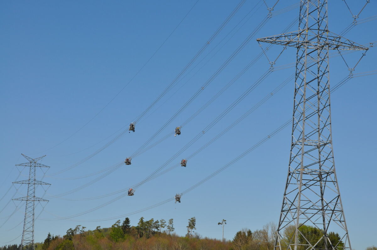 ST.JOHANN-WÜRTINGEN. Nichts für schwache Nerven ist die Arbeit in luftiger Höhe. Sechs Fahrstühle bewegen sich derzeit auf drei Traversenebenen der Überlandleitungen beim Oberen Lindenhof bei Würtingen vorwärts, schweben in 14 bis 59 Meter über Grund. Die Arbeitshöhen sind von den jeweiligen Masten, dem Seildurchhang und auch der Topografie abhängig. Schwer ist von unten zu erkennen, dass sich in jedem dieser Fahrstühle ein Mann befindet, der Abstandshalter an den Leiterseilen anbringt.