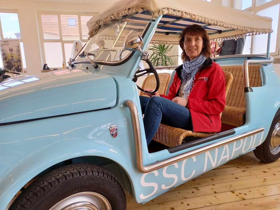 Ulrike Palesch in einem umgebauten Fiat Nuova 500 mit Korbsitzen und Markise, einer Leihgabe für die Sonderausstellung.