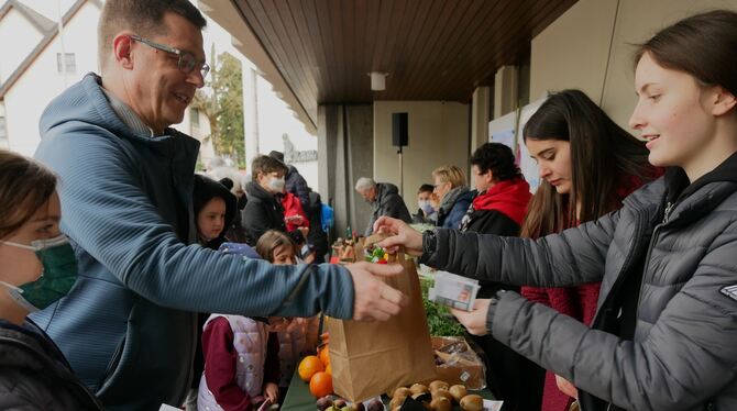 Und eins noch: Es gab auch ein Mittagessen, echt orientalisch – Gulasch vom Lamm mit selbst gebackenem Fladenbrot und Falafel. Nur das Wetter spielte nicht ganz mit. Zwar hatte am Morgen schon die Sonne geschienen, doch pünktlich zum Gottesdienstende begann es zu schneien. »Das ist jetzt nicht ganz so orientalisch«, kommentierte Burgmaier, freute sich aber dennoch über das Interesse an Salzen, Gewürzen (die von den Firmlingen selbst abgewogen und verpackt wurden) und auch an Obst und Gemüse. (GEA)