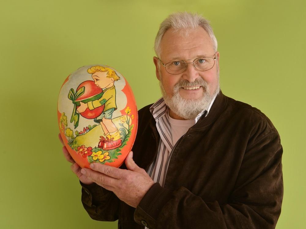 Dieses Papp-Ei, das Jürgen Pintscher in Händen hält, hat in den 1930er-Jahren als Oster-Verpackung gedient. FOTO: PR