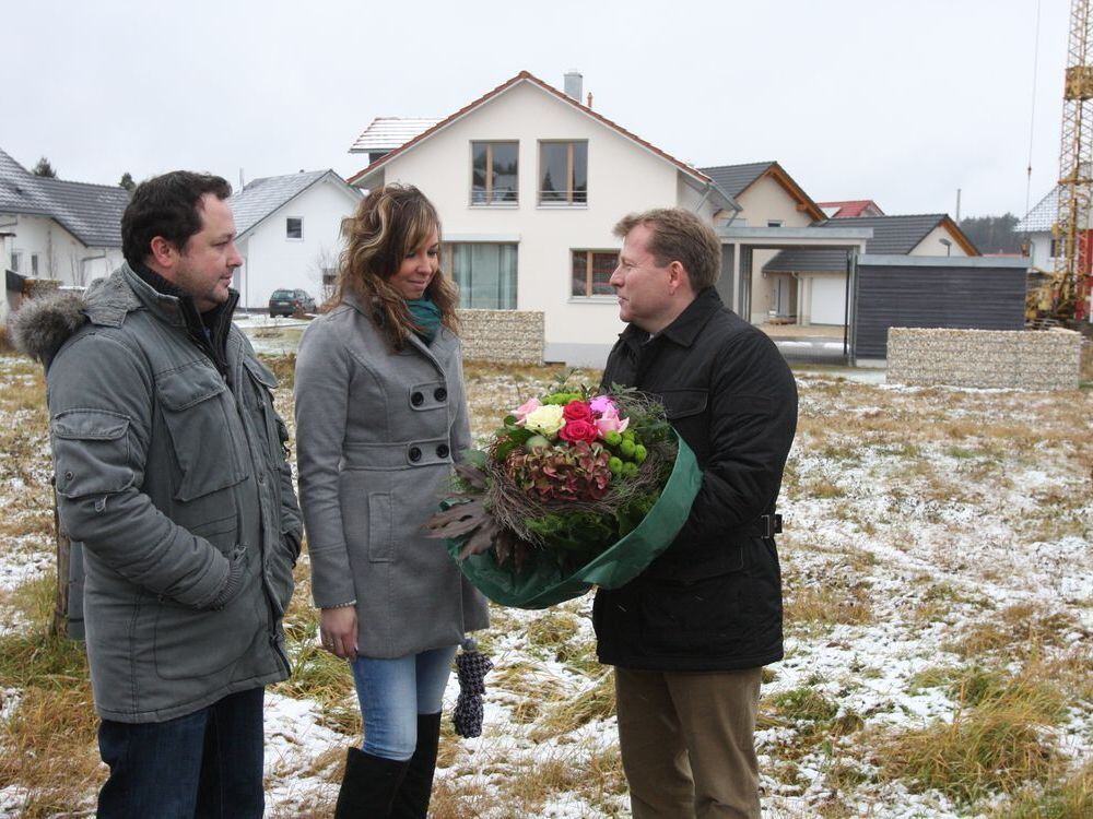 Bürgermeister Mike Münzing (rechts) beglückwünschte die neuen Grundeigentümer, Slawa und Valentina Hartmann zum Kauf mit einem Blumenstrauß.