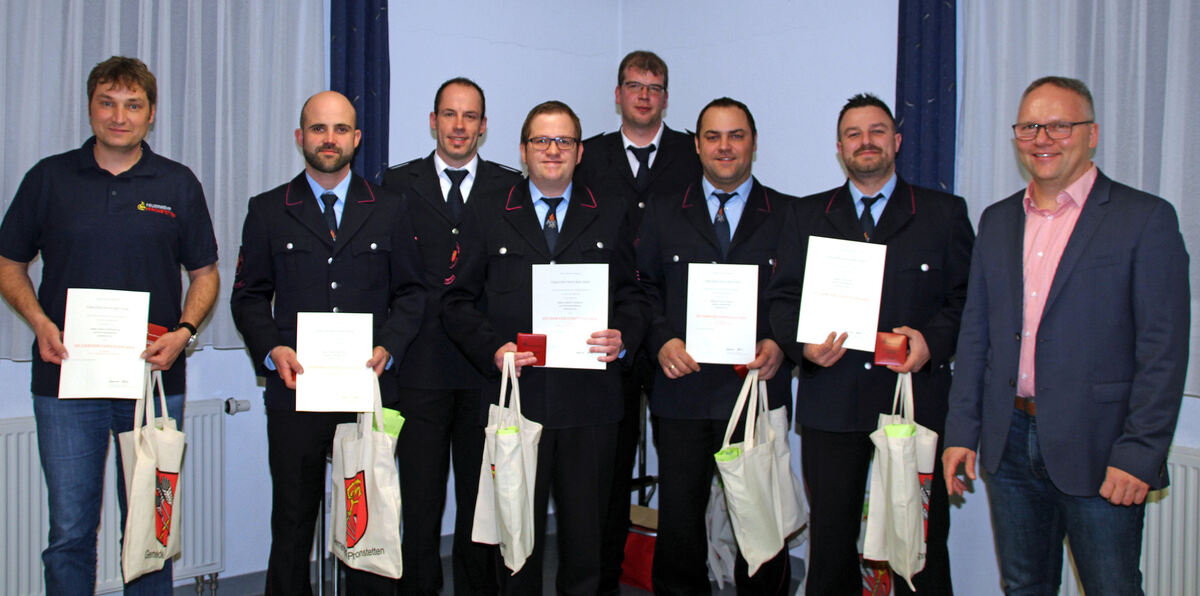 Das Feuerwehr-Ehrenkreuz in Bronze für 15 Jahre aktiven Dienst ging an Daniel Bahrt, Matthias Störkle, Andreas Waidmann, Christoph Auchter, Florian Bockmaier und Michael Engst. Das Feuerwehr-Ehrenkreuz in Silber für 25 Jahre Dienst erhielten Achim Stoll, Markus Engst, Klaus Josef Raach und Markus Bodenmüller.
