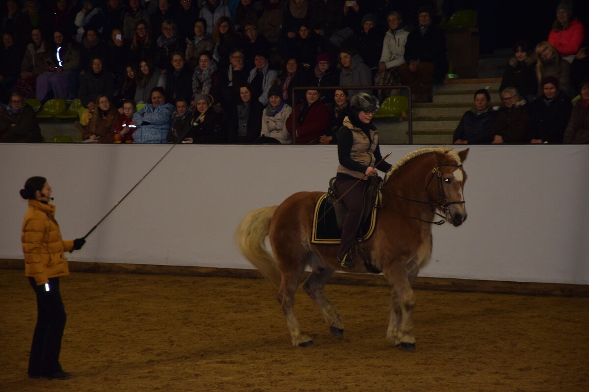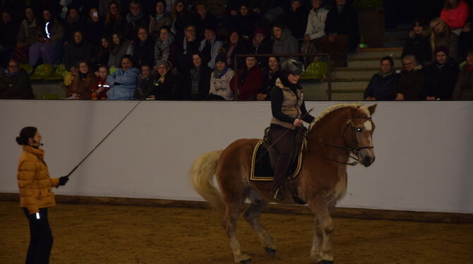 Der Haflinger Rudi zeigt mit seiner Reiterin Susi Lobenhofer eine einwandfreie Piaffe mit korrekter Beugung seiner großen Gelenke im Achterteil. Kommentiert, angeleitet und von viel Lob begleitet von Anja Beran in Marbach. GEA-FOTO: GEIGER