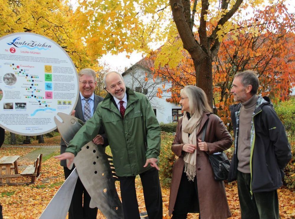 Über das zweite Lauter-Zeichen, das an der Mühlenbrücke in Gomadingen seinen Platz gefunden hat, freuen sich (von links) Bürgermeister Klemens Betz, Landrat Thomas Reumann, die Künstlerin Monika Geiselhart und Manfred Waßner, einer der Initiatoren des Kulturprojekts am »schönsten Nebenfluss der Donau«. GEA-FOTO: DEWALD