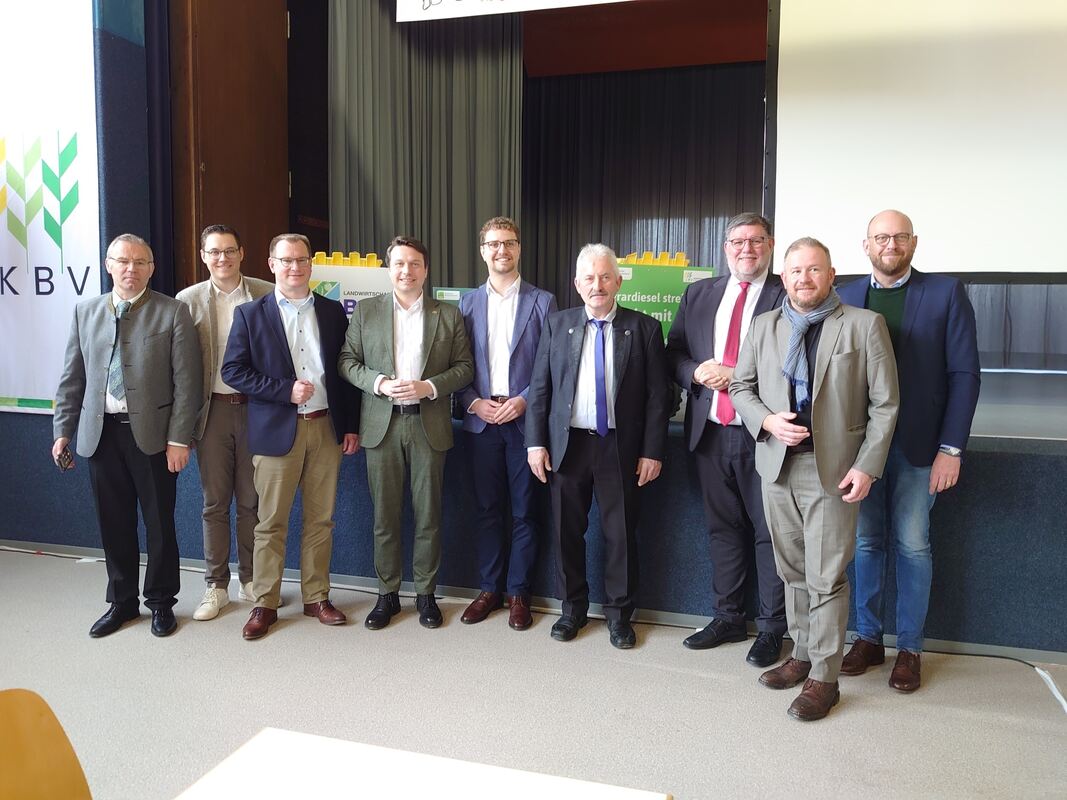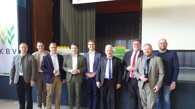 Die versammelte Politprominenz: Norber Lins (MdEP, von links), Eric Sindek (Bürgermeister Eningen), Mario Storz (Bürgermeister Engstingen), Manuel Hailfinger (MdL), Simon Baier, (Bürgermeister Hohenstein), Kreisbauernchef Gebhard Aierstock, Landrat Ulrich Fiedler, Andreas Glück (MdEP) und Florian Bauer (Bürgermeister St. Johann). FOTO: WURSTER
