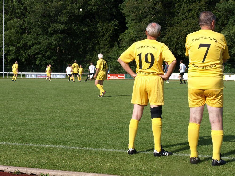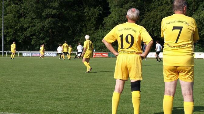 Aus fast jeder Perspektive interessant und auch amüsant: der Prominentenkick in Gammertingen - und von Schiedsrichter Alper Aktepe souverän geleitet. FOTO: BUTSCHER