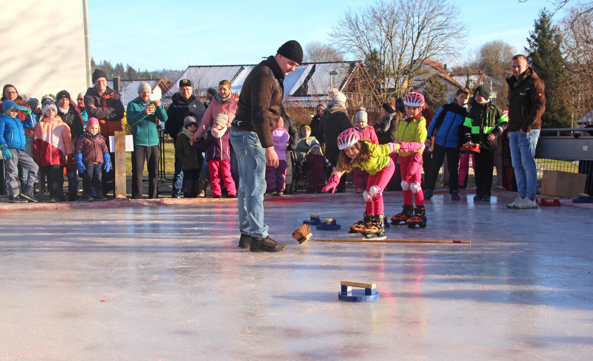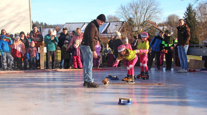 Eisstockschießen à la Feuerwehr Kohlstetten: Kinder und Erwachsene hatten viel Spaß auf und neben der Eisbahn. FOTO: LEIPPERT