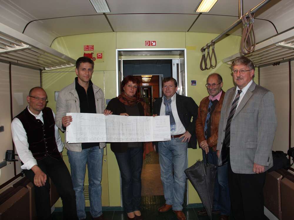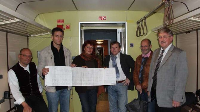 Der Zug ist das verbindende Element eines neuen interkommunalen Radwanderwegs, der von Gomadingen nach Schelklingen führen soll. Bernd-Matthias Weckler, Tobias Brammer, Ursel Maichle-Schmitt und die Bürgermeister Mike Münzing, Michael Knapp und Klemens Betz (von links) stellten das Gemeinschaftsprojekt auf dem Münsinger Bahnhof vor.
