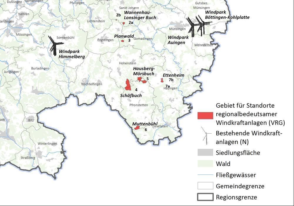 Muttenbühl Pfronstetten/Zwiefalten: 60 Hektar, Platz für 4 bis 6 Anlagen. 1,1 Kilometer südwestlich von Geisingen und 1,6 Kilometer nordwestlich von Upflamör.