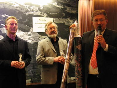 Dank für die »Hauptpersonen«: Ohne Klaus und Heinz Besch (von links) ruhte die römische Geschichte Gomadingens immer noch im Dornröschenschlaf, meinte Bürgermeister Klemens Betz beim »Römerabend«.