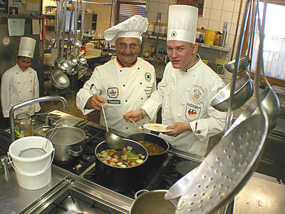 »Der Einsatzbereite« nennen sie Simon Tress (rechts) in der Jugendnationalmannschaft der Köche. Hier zaubert er am elterlichen Herd in der Ehestetter »Rose« zusammen mit Hermann Bucher, dem Vorsitzenden des Ravensburger »Club der Köche«. Am 23. August trainiert Tress junior im Ehestetter »Haus der Lilie« zusammen mit seinen Kollegen auf die Olympiade. Es darf gekostet werden.