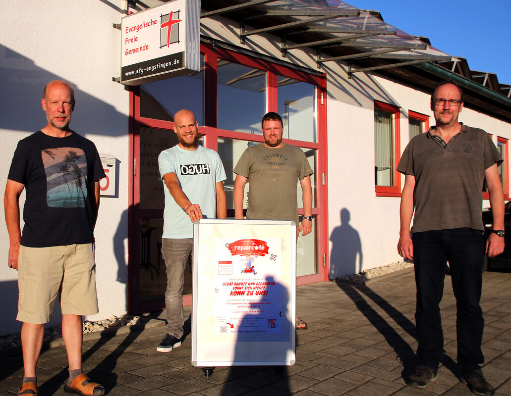 Siegbert Rieker , Daniel Rieker, Jonathan Mohr und Volker Kalkau (von links) nehmen sich im Repaircafé der Evangelischen Freien Gemeinde defekter Geräte an. FOTO: LEIPPERT