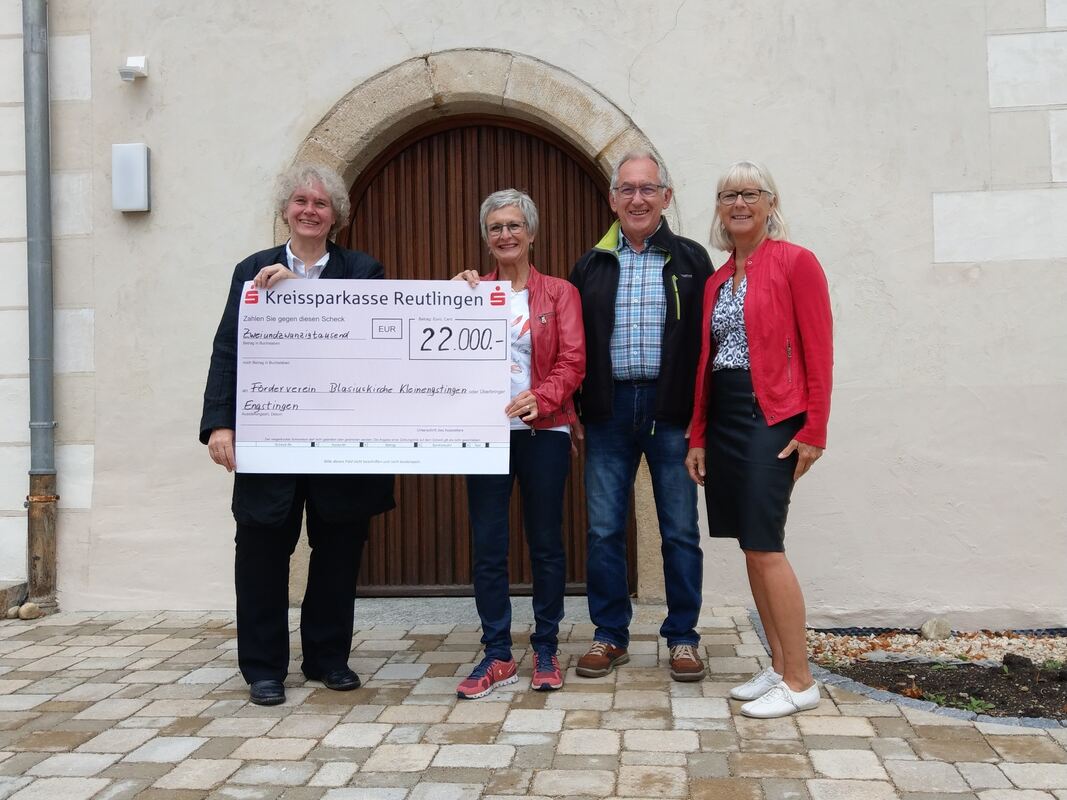 Pfarrerin Hanna Bader (links) erhielt einen Scheck über 22 000 Euro vom Förderverein der Blasiuskirche, vertreten durch Kassiererin Renate Dötsch (Zweite von links), Schriftführer Gerhard Rominger und die Erste Vorsitzende Vera Vöhringer. FOTO: BÖHM