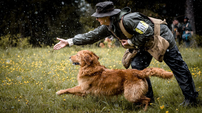 Sechzig Hundeführer aus vier Ländern beteiligen sich am »Retriever Dummy Trial« bei Münsingen. Per Handzeichen weisen die Teilnehmer ihren vierbeinigen Partnern den Weg zur symbolischen Beute. FOTOS: THORE BROCKHOFF